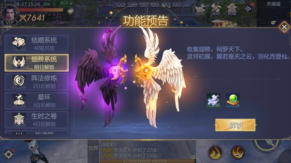 游戏中玩家可以获得各式各样,风格不同的翅膀,翅膀不仅可以穿戴在角色身上,丰富形象,同时也可以为玩家带来额外的属性加持,翅膀分为主翼和分翼,同时也可以通过升阶、升星、羁绊、雕文、专精等途径来进一步增强玩家的属性。