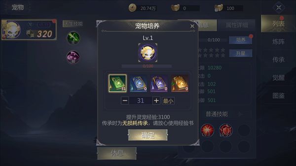 游戏中每个玩家都可以拥有一只属于自己的灵宠,灵宠种类繁多,不同的灵宠拥有不同的主动以及被动技能,帮助玩家战斗的同时,也可以通过传承、升星、修炼、吞噬、练阵、觉醒等方式来培养灵宠,为玩家带来属性上的增幅。