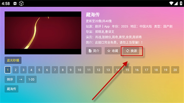 4、播放线路要是出现问题,可点击 “换源” 按钮,选择其他线路进行播放。