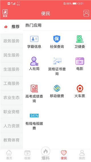 1、从首页切换到便民界面,点击政务服务的“学籍信息”。