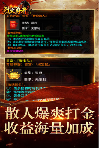 烈火勇者折扣服是一款高爆率传奇闯关游戏,诸多武器道具全部可以免费获取,平民玩家也可以打造极品神装。游戏截图