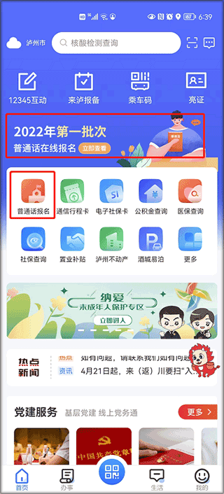 1、在软件首页,找到【普通话报名】服务并点击,然后点击【年普通话水平测试】进入。
