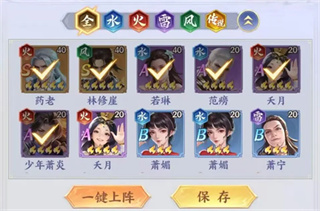 阵容分析:药老开局就能打出群攻,可放在一号位用于压低敌方血线,由二号位的林修崖收割,触发他的击杀再动完成清场。其他的火、风系角色提供羁绊,触发“双源争锋”组队加成(生命+10%、攻击+10%),实战中可不用出手。药老、林修崖练度足够时,本阵容可轻松打到第四章以上。注:玩家随指引进行第一次、第二次招募时,就能分别拿到林修崖和药老。