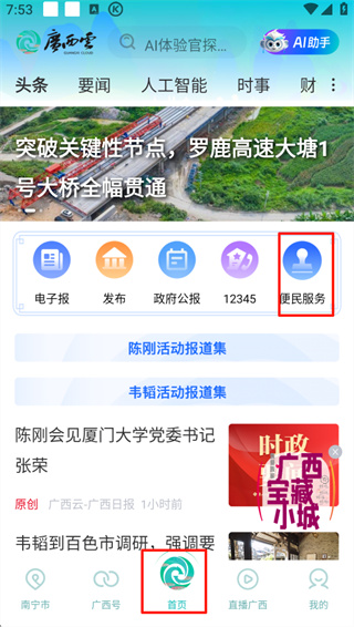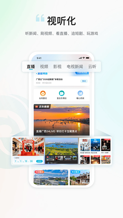 广西云app是一款生活助手软件。打开首页,你可以自己动手装修,喜欢看新闻就把新闻模块放前面,经常查天气就把天气模块调出来,交通出行、本地热点也能随时切换。新闻板块里,从本地新鲜事到全国大事件,图文、视频、直播应有尽有,刷起来像翻报纸又像看短视频,更新还特别快。