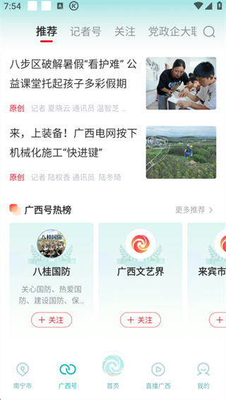 1、打开软件可以在广西号板块观看各种热榜新闻,直播板块可以看到广西的各种直播。