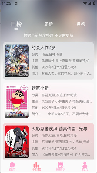 3、排行榜页将动漫进行了日榜、周榜以及月榜排序。