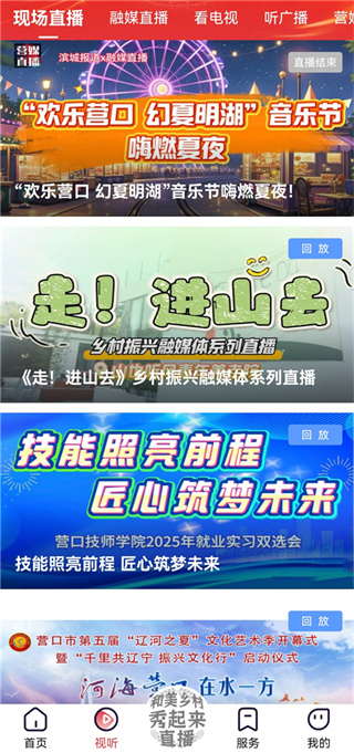 2、切换到【视听】页,就可以看到营口本地的一些直播和直播回放。