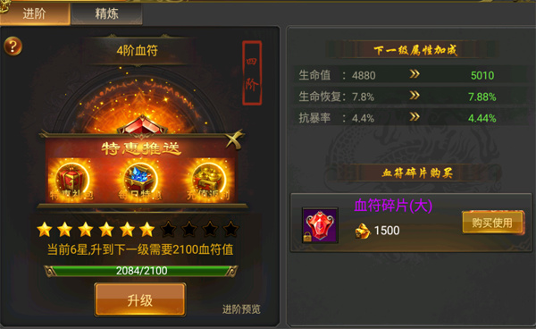 血符系统是加生命值,回血,和抗暴击的,血符的产出在绑元商城,boos地图,副本都能得到,阶为越高加的属性就越高,每天可以多挂机打打boos可以得到大量的血符碎片用来升级血符。