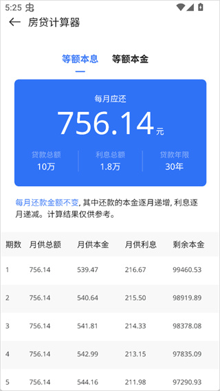 5、系统将生成两种还款方案:等额本息和等额本金,供用户参考。