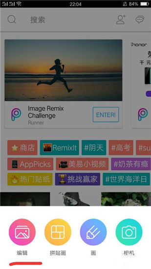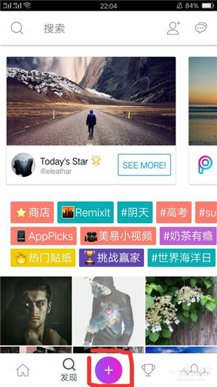 首先,我们打开进入PicsArt软件, 然后点击屏幕下方的“+”图标