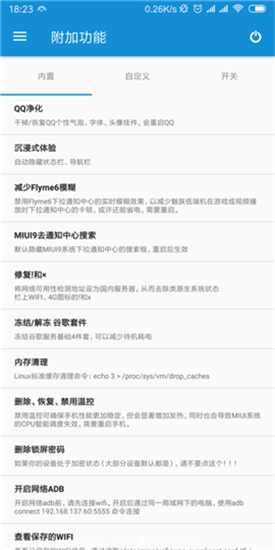 1、后台管理:目前功能较弱,需要配合辅助功能使用离开销毁:被勾选的应用,在离开主界面后立即销毁相关进程(不能阻止其自动重启)