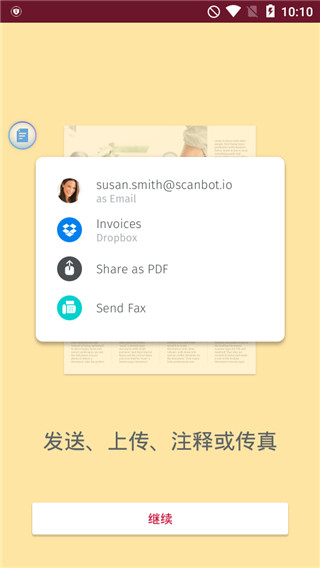 扫描后的文档可以通过电子邮件发送,可以打印或上传到支持的云驱动中。如果您启用自动上传功能,app将会在您的 PDF 扫描件创建时,自动将扫描件保存到您首选的云服务中。使用Scanbot安卓版,您可以将扫描件上传到下列云驱动中: