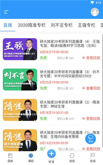 1、直播课程:定期举办王强、隋准等名师的直播讲座,从选校择业,到复试指导,一应俱全。