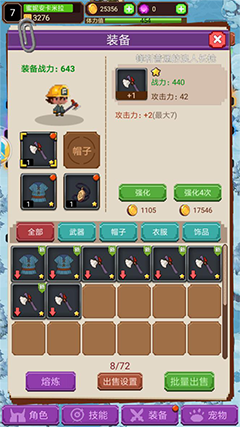 首先右下的装备按钮,如果您挂机比较久的话,会看到琳琅满面的装备,游戏贴心的把品质较高的装备展示在前列,并且装备后属性提升或者下降都明确标识出来了。