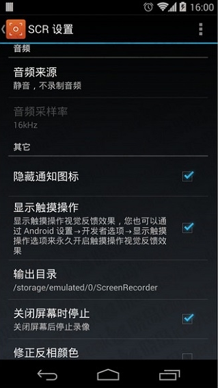 2、提供了一些辅助选项,例如隐藏状态栏通知、显示触摸操作(这个极其有用,可以展示你对手机屏幕的操作流程)、视频存储目录、停止录像方式、修正反相颜色