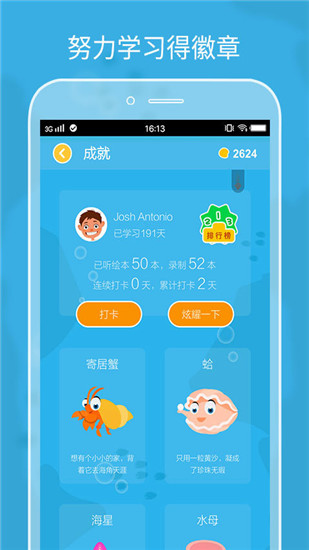 1、成就系统,通过听老师绘本,自己读绘本,免费获得星星,兑换“专属成就”