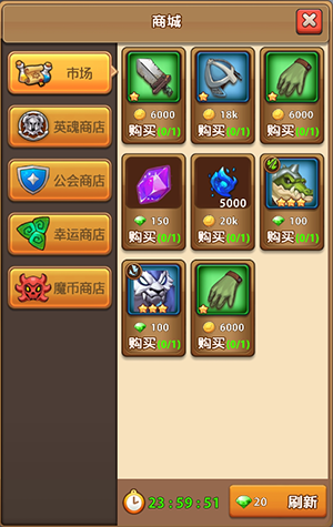 市场中可以使用金币和钻石购买低阶装备、三星英雄、普通水晶、高级水晶、战魂、绿魂,每天可以免费刷新一次市场内的物品,再次刷新就需要钻石刷新。