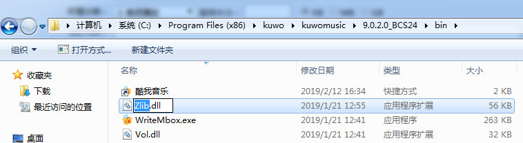2:安装完成后定位到酷我音乐安装的路径,小编软件安装的位置是:“C:Program Files (x86)kuwokuwomusic9.0.2.0_BCS24”,找到里面的bin文件夹。找到“Zlib.dll”文件,将它重命名为“Mrack.dll”。