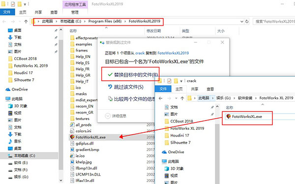 6、安装完成后将破解补丁复制到安装目录下替换原文件即可,一般默认安装目录为“C:Program Files (x86)FotoWorksXL2019”