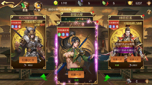 l群雄招募可招募蓝、紫、橙将,各种阵营持续两天(魏将招募、蜀将招募、吴将招募、群雄招募进行轮换),每天24点会重置招募次数,15抽必出橙将!主公们可消耗元宝进行招募. 并且每多抽一次抽到橙色武将的几率就会变大,如果囊中羞涩,那就先单抽几下,也是极好的.