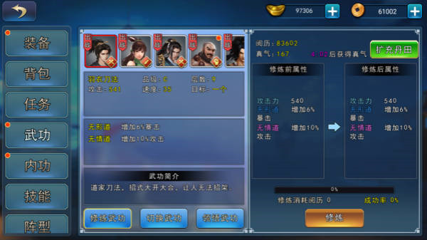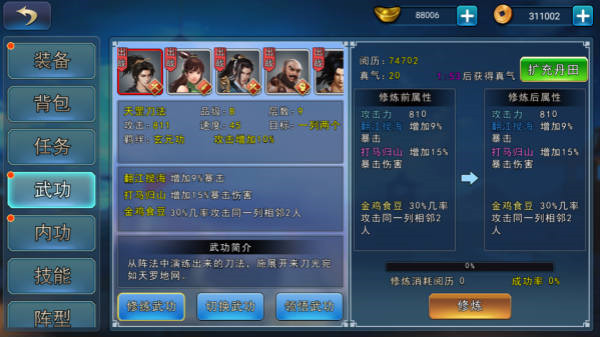 学习武功内功都要从低级学起,先从D级学起,先从韩非拜师学起,每个武功内功学到9重,出师,学习更高级C,以此类推。