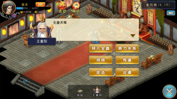 重阳殿找王重阳(5,10)传道,达到100道学后可以论道,论道答对每题加5点道学,答错等1分钟后继续论道,道学达到200后,到三清殿王处一(3,9)研读《道德经》提升道学到250后研读《南华真经》提升道学到300。