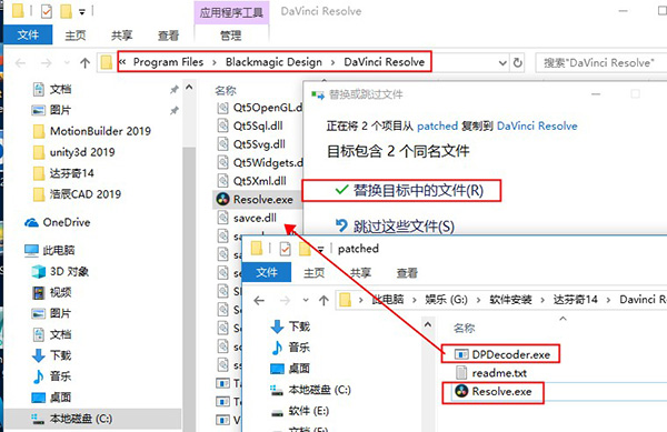 7、安装完成后将破解补丁都复制到C:Program FilesBlackmagic DesignDaVinci Resolve目录下替换原文件即可