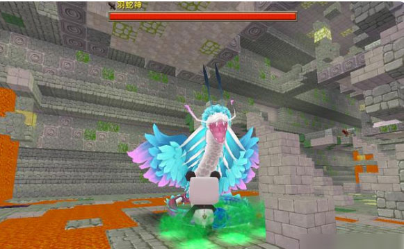 进入建筑物后可以看到强BOSS羽蛇神在底部,当玩家靠近的时候就会被攻击,它的攻击方式是向玩家吐出绿色的气体,只要玩家碰到后就会迅速的掉血,所以要时刻保持注意力,需要灵活的走位操控才能避免被羽蛇神的武器攻击到。