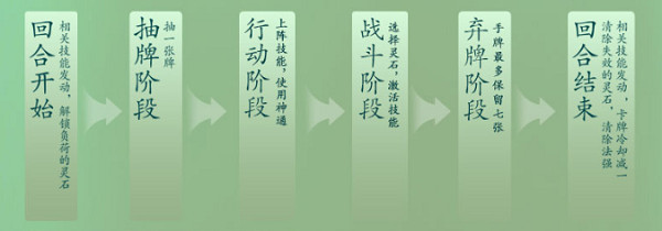 触发本阶段的被动技能;我方卡牌冷却值-1;清除失效的灵石(每颗灵石只能存在3个自己的回合);法强值清零(法强只会在自己的回合结束时清零)