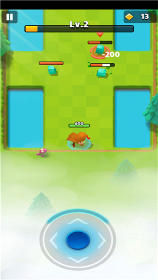 游戏采用了双摇杆的操作方式,左边屏幕自由滑动会出现摇杆控制走位,右边屏幕自由滑动则可以控制攻击方向。或许刚开始大家会有一些不习惯,不过适应之后就觉得还可以。只是大家需要注意,战斗的时候是需要右边屏幕摇杆滑动方向来确认攻击方向的,并不是通过自由点击。游戏中屏幕上边会有一个蓝色的横条,这就是能量条,当我的角色在地图中收集到足够多的能量水晶的时候,能量条就会升级,在升级的时候,玩家们的体型会增大,而且还会随机出现三个技能共玩家选择。