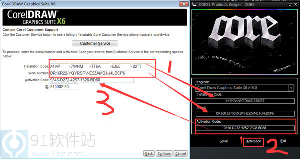 10、将coreldraw x6软件中提示的两串英文输入到注册机相对应的位置,点击注册机的“Activation”生成序列号,复制过去即可