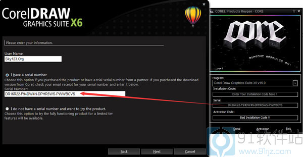 2、打开注册机和安装程序,将注册机选择为“Corel Draw Graphics Suite X6 v16.0”,将下放的“serial”复制到注册框中
