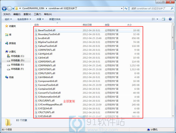 1、将相同版本的coreldraw x6中文汉化补丁打开,复制里面所有的文件
