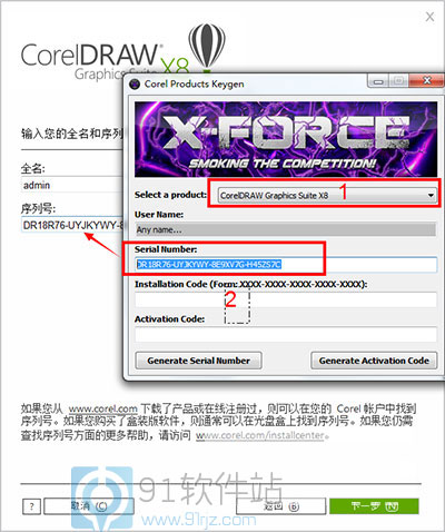 2、打开安装包下的注册机,修改版本为“CorelDRAW Graphics Suite X8”,点击“Generate Serial Number”,然后将序列号复制到安装程序中。