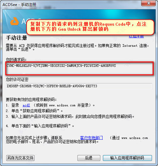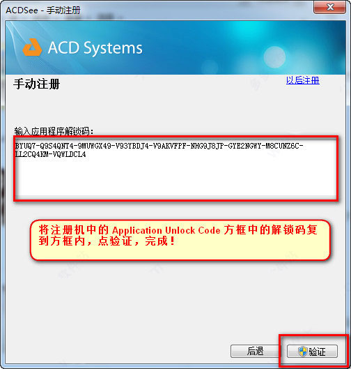 6、点手动注册面板右下角的输入应用程序解锁码,将注册机 Application Unlock Code 方框中的解锁码复到方框内,点验证ACDSee 17汉化破解版安装完成!