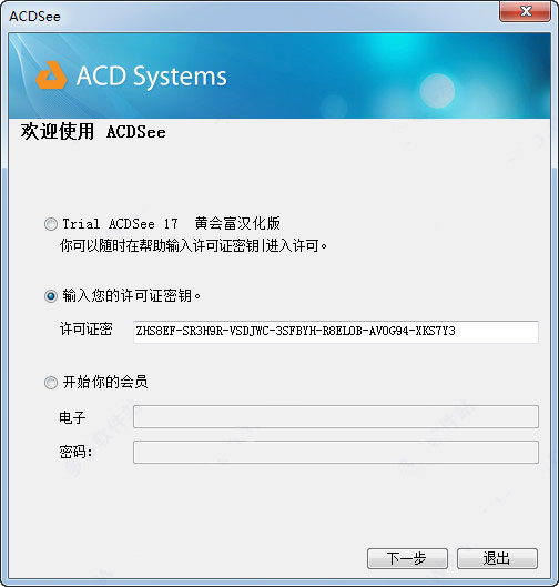 3、运行ACDSee 17桌面快捷方式,将注册机“License key”框内的序列号复过来,点下一步