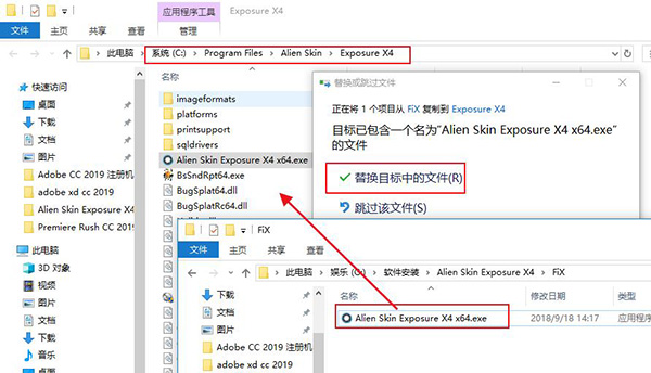 安装完成后不要运行,将fix中的Alien Skin Exposure X4 x64.exe复制到软件安装目录中替换。一般默认安装目录为“C:Program FilesAlien SkinExposure X4”