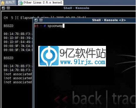 4.继续输入→spoonwep然后会出现一个窗口,接下来是注意最重要的部分,→第一个mon0、→第二个normal、→第三个unknown victim点next就会跳到另一个窗口,在新的窗口的右上角会出现launch,点击launch,桌面最下面那一栏spoonwep vict.scan,点击它回到刚刚那个界面有√的为有客户端,破解起来比较容易点,击要破解的网络,在点击下面的SELECTION OK,然后点击左上角的LAUNCH等待一段时间,等Data跑到1W到2W或3W密码就破解出来了,