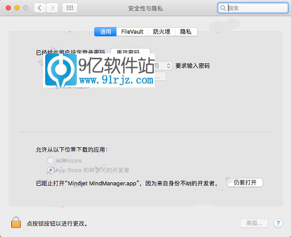 2、在“安全与隐私”模块里,你会看到那条被拦截的安装命令,我们只需要点击一次“仍要打开”,即可运行Mindjet MindManager(思维导图)mac破解版,而且只需要一次,以后不会再提示