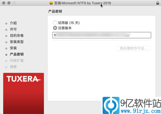 将Tuxera NTFS激活密钥复制粘贴到tuxera NTFS 2019 注册界面,然后点击【继续】。