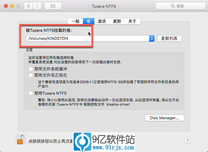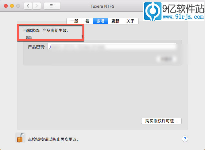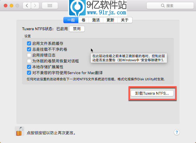 3.解锁打开,在一般的目录下,显示Tuxera NTFS 2018 Mac状态:已启用。在右下角您可以看到卸载Tuxera NTFS 2018 Mac的提示,以后卸载该款软件,就在这里卸载。