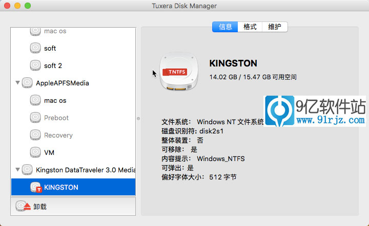 1.重启电脑后,应用程序安装好的Tuxera NTFS 2018 Mac打开,插上您的移动硬盘,点击移动硬盘,右边会显示移动硬盘的信息,由此证明Tuxera NTFS 2018 Mac已经安装成功,读写正常。