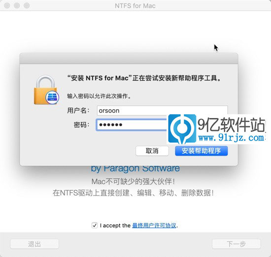 请输入电脑呢密码,以允许安装 Paragon NTFS for Mac 17继续安装,如图