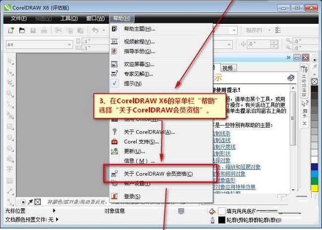 2、随后打开软件,进入主界面,在菜单栏中,点击“帮助”,选择“关于coreldraw会员资格”,准备激活工作。
