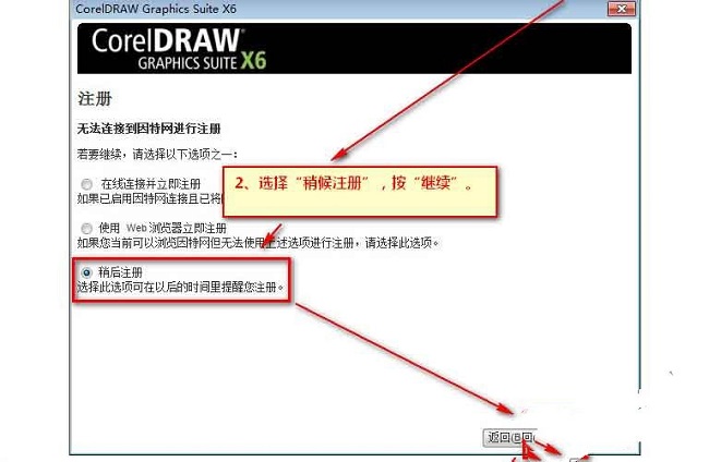 Coreldraw X61、激活示意操作如图:选择“稍后注册”,然后在选择继续
