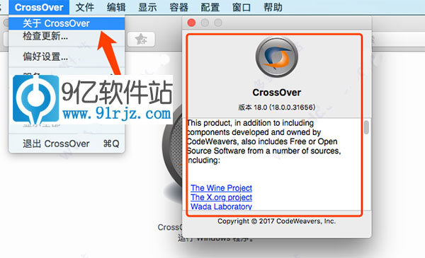 2、等待软件安装完成,可在应用程序中打开软件,安装即是破解,你可以点击菜单栏上方的软件标识,选择“关于crossover 18”查看软件的相关版本信息。