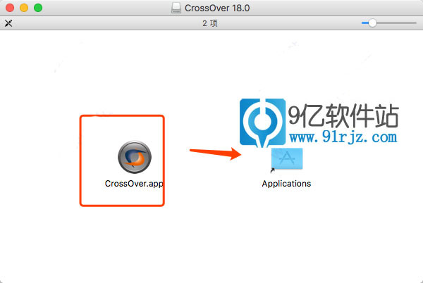 1、打开在本站下载的镜像包,将“crossover 18.app”拖入“applications”当中。