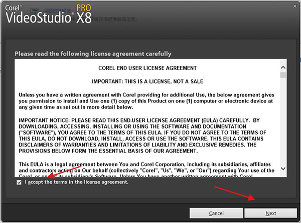 会声会影x81、下载数据包然后解压,双击VideoStudioProX8_64bit_1Main.exe安装X8 Pro勾选“I accept the terms in the license agreement”然后点击next