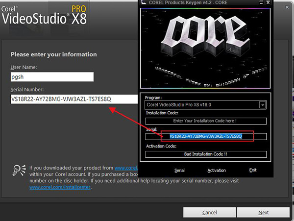 2、回到数据包中运行注册机,在注册机上选择对应的冉家版本然后点击serial生成序列号,再将序列号复制到软件上并点击next