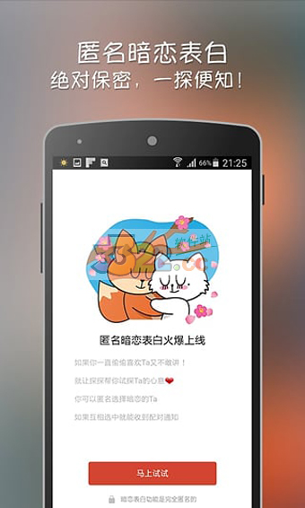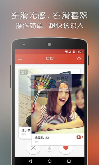 【简单】左滑无感、右滑喜欢,互相喜欢即配对聊天【安全】不会泄露心意,Ta不知道你的选择,除非Ta也喜欢你
